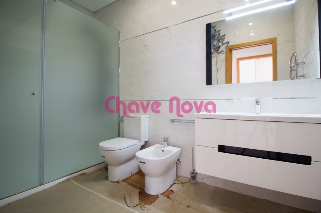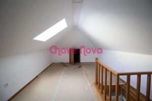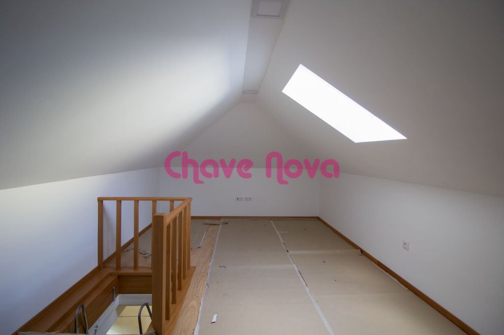 No piso superior encontramos, em frente a sala e, do lado direito uma cozinha equipada com placa, forno, exaustor, frigorífico, microondas. Do lado esquerdo, encontramos os dois quartos com roupeiros embutidos e os dois wc´s. O wc completo dá acesso a um sótão de dimensões consideráveis. A moradia dispõe de estores eléctricos, iluminação LED, alarme, aquecimento central e ar condicionado.